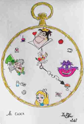 Jour 14. Horloge. Le lapin blanc m'est apparu immédiatement. L'horloge finale est presque venue en même temps. Les bords sont dessinés au crayon doré et mon Alice a vraiment une sale tête ! ^^ Ce dessin m'a pris un temps infini, pour un résultat plutôt médiocre. La coloration aux crayons feutres, même si elle ressort bien, n'est vraiment pas belle !